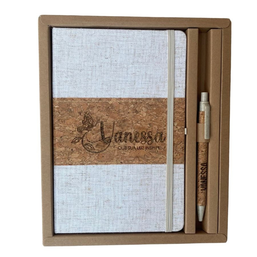 Este kit contém uma Caderneta A5 em linho com detalhe em cortiça e suporte para caneta, marcador de página em cetim, aproximadamente 82 folhas com pauta e caneta de cortiça com detalhes em palha de trigo, carga esferográfica azul 1.0mm e acionamento por clique.