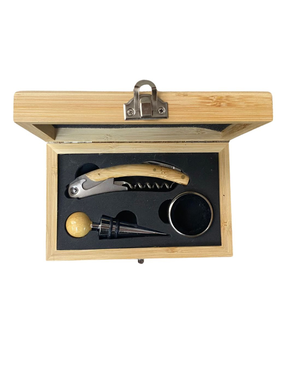 O kit vinho com 3 peças com estojo de bambu é a escolha perfeita para quem busca elegância e funcionalidade. Acompanha um saca-rolhas metálico com acabamento em bambu, que possui lâmina de corte e abridor de garrafa, uma tampa de bico com detalhe em bambu e silicone, e um wine collar. A caixa de bambu tem um design sofisticado e rústico, e contém ainda um berço de espuma interno, garantindo a proteção dos itens.